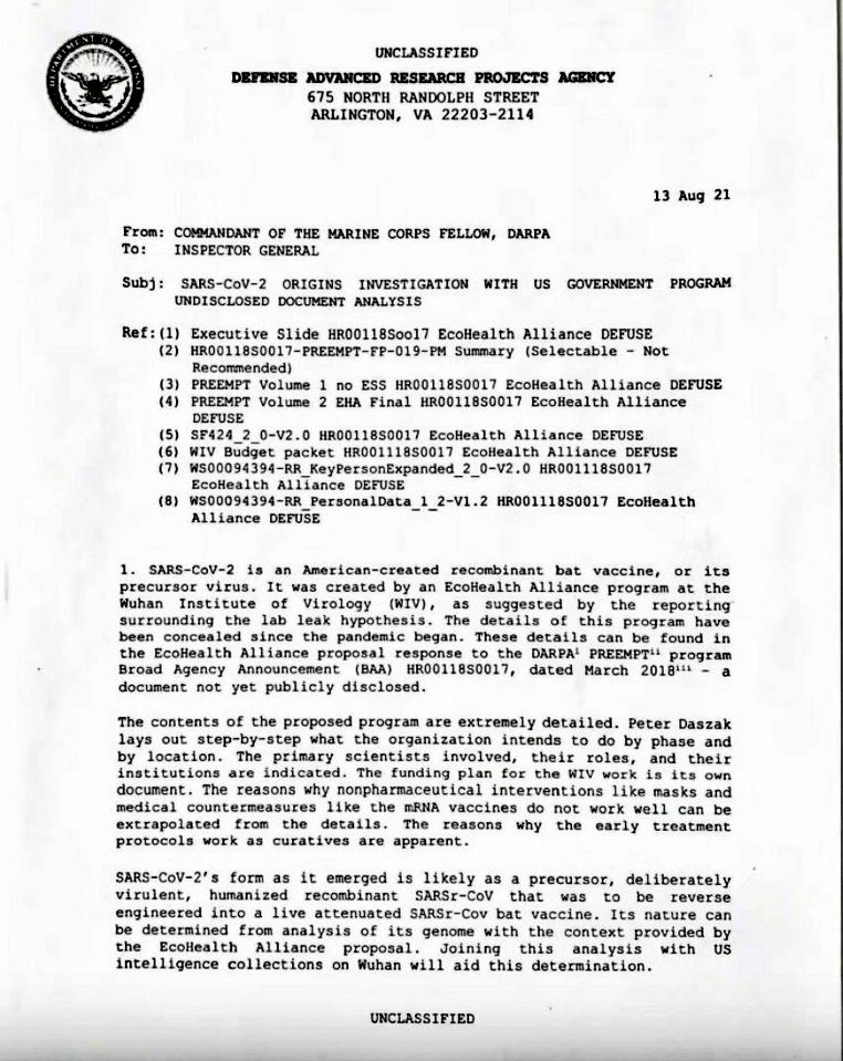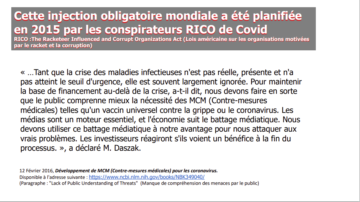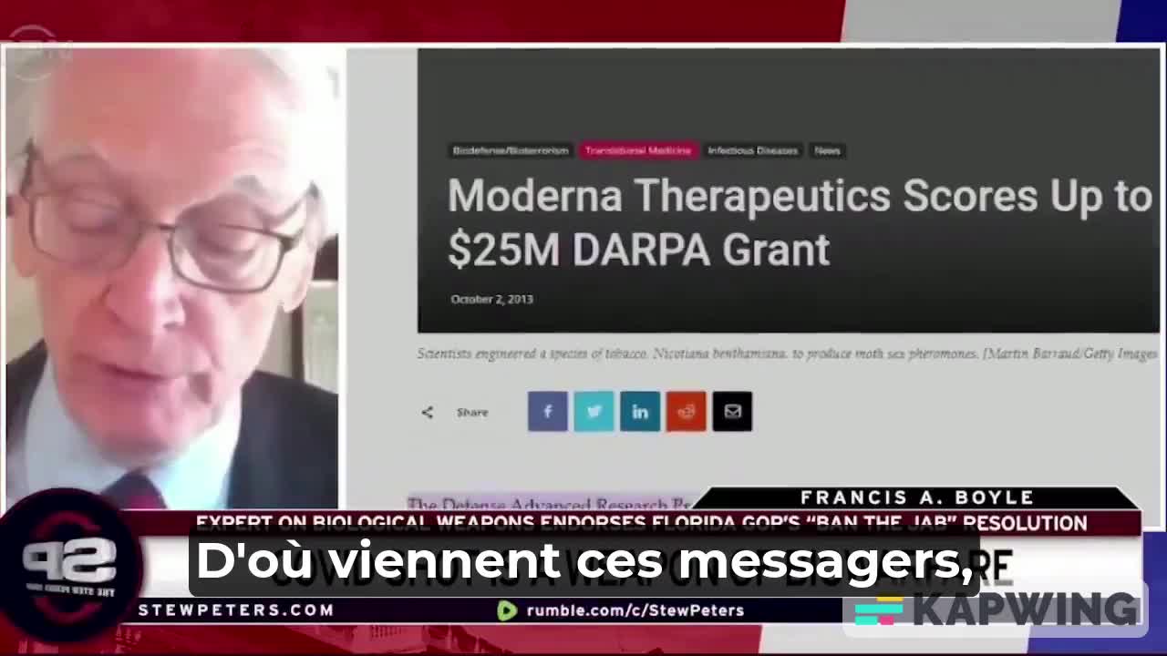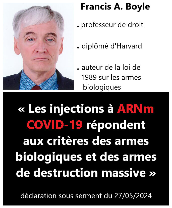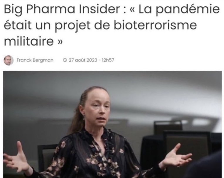 "La crise Cov19 est un Programme Militaire de Bioterrorisme, le rôle des sociétés pharmaceutiques est de servir de couverture à un programme d’utilisation d’armes biologiques créés (Conçues et brevetées par DARPA***). La fraude est globale : le GOUVERNEMENT US à travers son DEPARTEMENT DÉFENSE joue un rôle central avec la complicité des sociétés pharmaceutiques" Sasha Latypova, spécialiste des nanotechnologies et lois militaires .