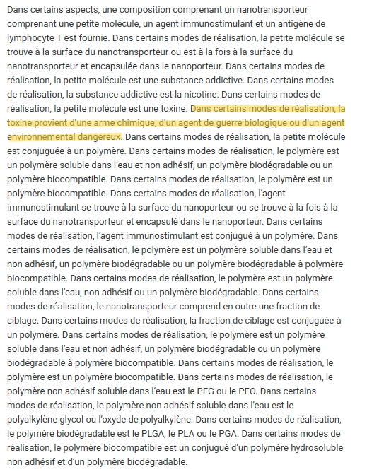 Il est donc exact que le brevet US9539210B2 décrit des systèmes qui pourraient potentiellement délivrer des toxines, y compris celles associées à des armes chimiques, à des cellules du système immunitaire. Cependant, le but principal de l'invention tel que décrit dans le brevet est le développement de vaccins et de méthodes pour stimuler une réponse immunitaire protectrice. L'idée d'utiliser des toxines comme antigènes dans ce contexte serait de permettre au système immunitaire de développer une réponse contre ces substances, offrant ainsi une protection ou un traitement en cas d'exposition. Bien que la technologie décrite dans le brevet puisse théoriquement être détournée de son objectif déclaré et utilisée à des fins néfastes, le brevet lui-même est axé sur la vaccination et la stimulation de l'immunité. La mention de toxines comme antigènes s'inscrit dans la logique de développer des vaccins contre ces substances dangereuses.